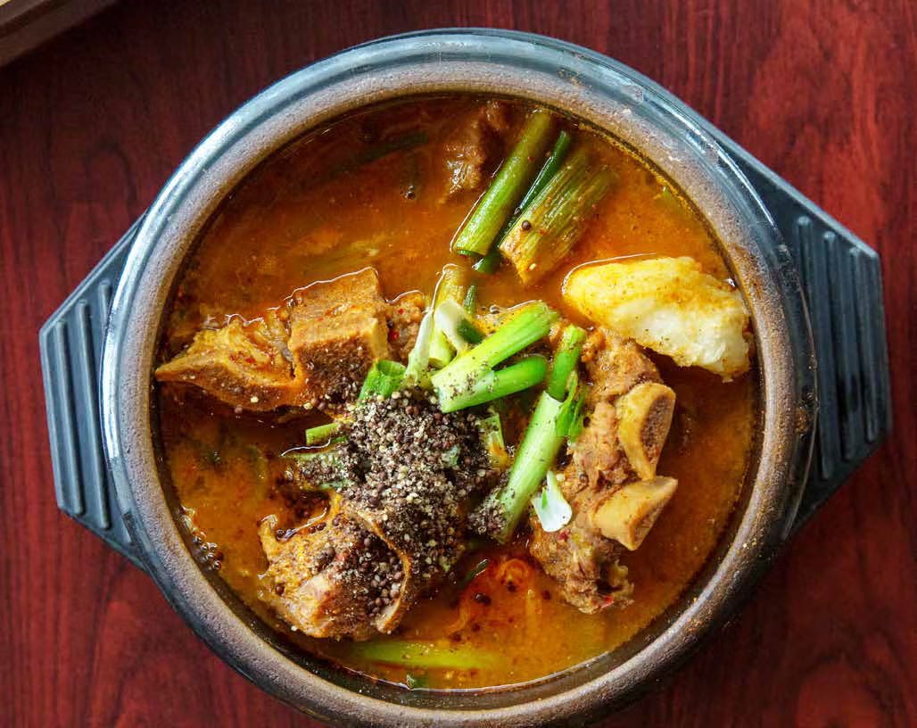 Gamjatang 감자탕. Literally “potato soup,” but typically includes large pieces of pork bone and meat.” One of my favorite Korean dishes.