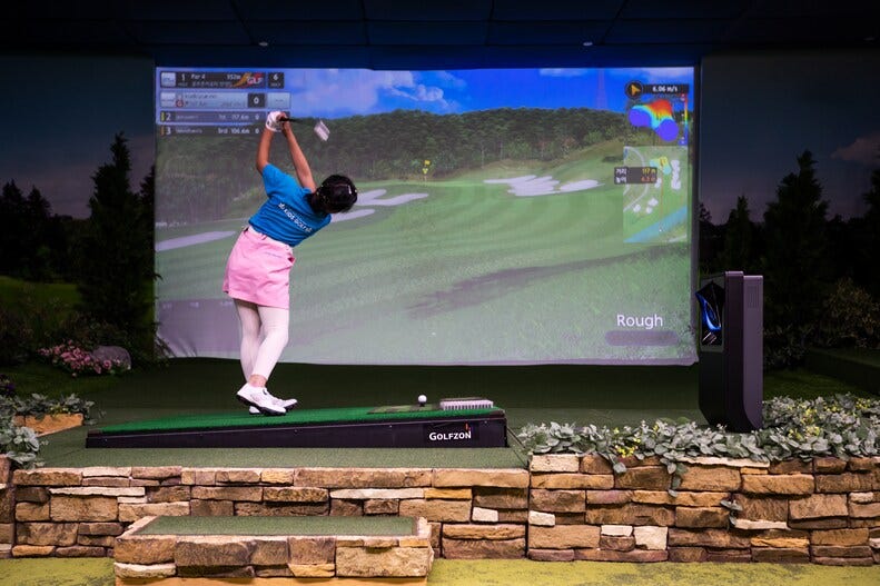 Screen Golf. cheaper, easier, more diverse and more common in Korea than in America. There is usually a shop within walking distance in most large metro areas. I would get 30 minutes on the “driving range” and “18 holes” for $7. They usually have club rental options and beer too. “Golfzone Park” (골프존 파크) is a popular chain.