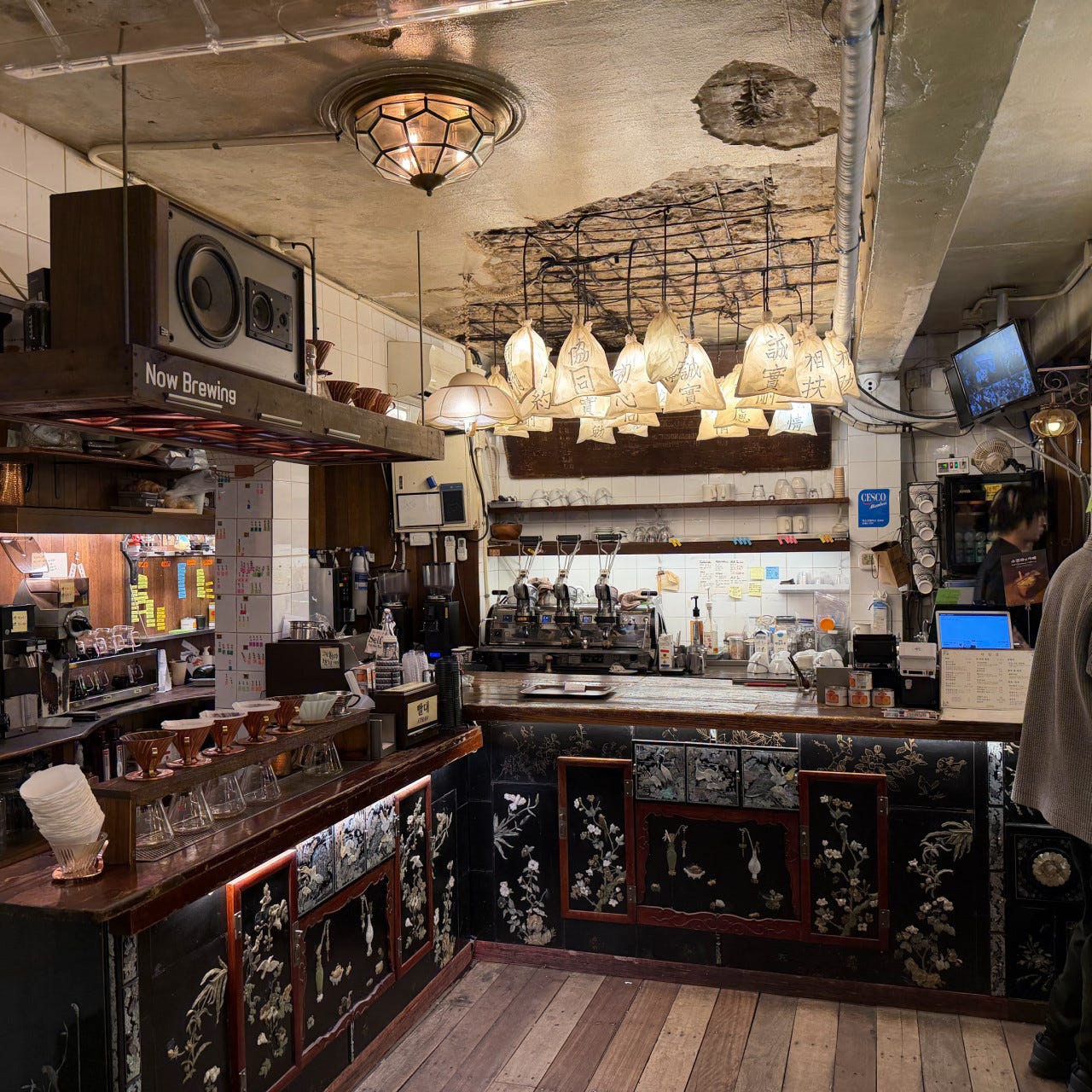This coffee shop is hidden in a back alley in Euljiro. It is adorned with beautiful mother of pearl artwork and giant exotic fish.