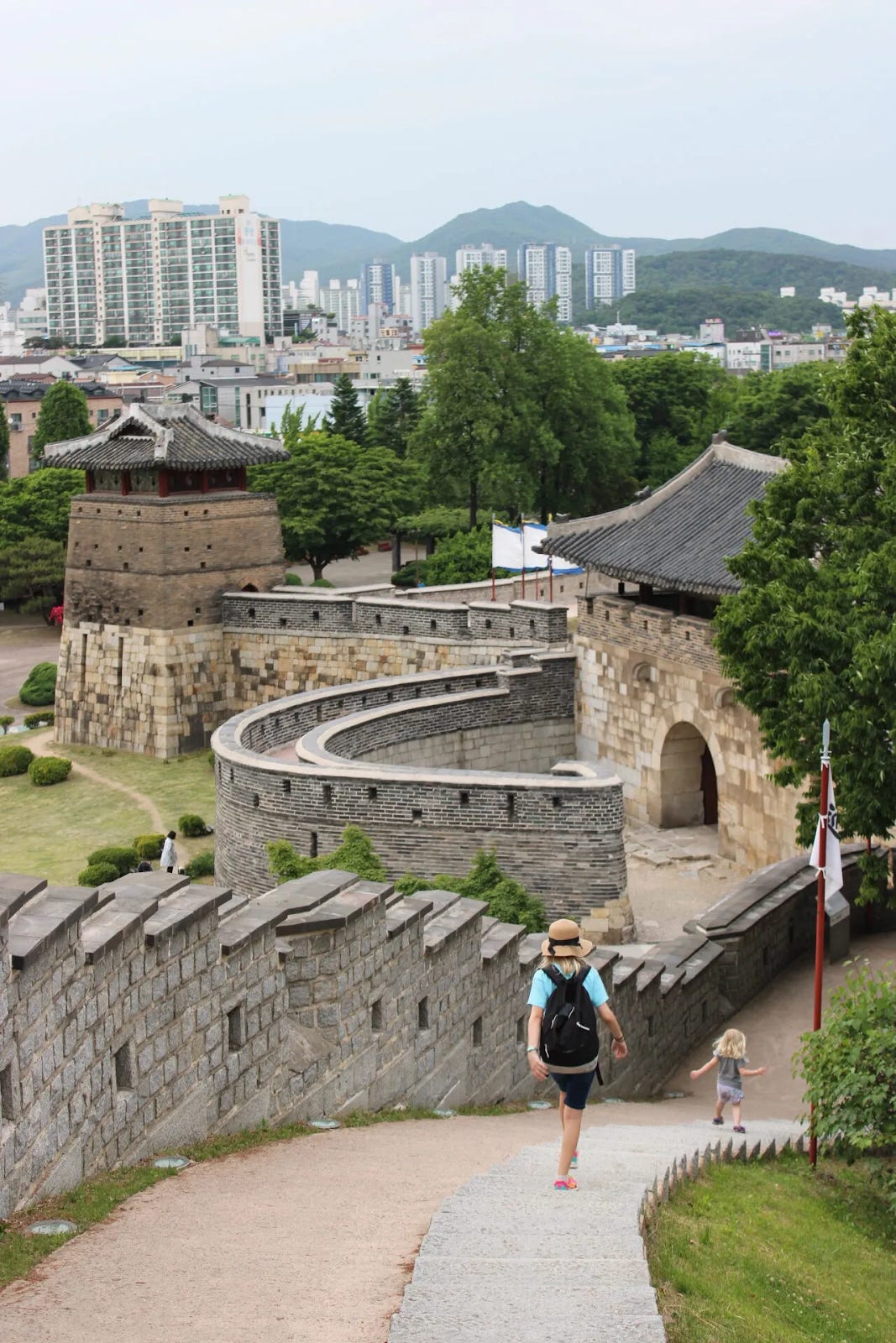 Suwon Hwaseong Fortress 수원 화성. Main touristy area with a fortress wall / walking trail and traditional style town.